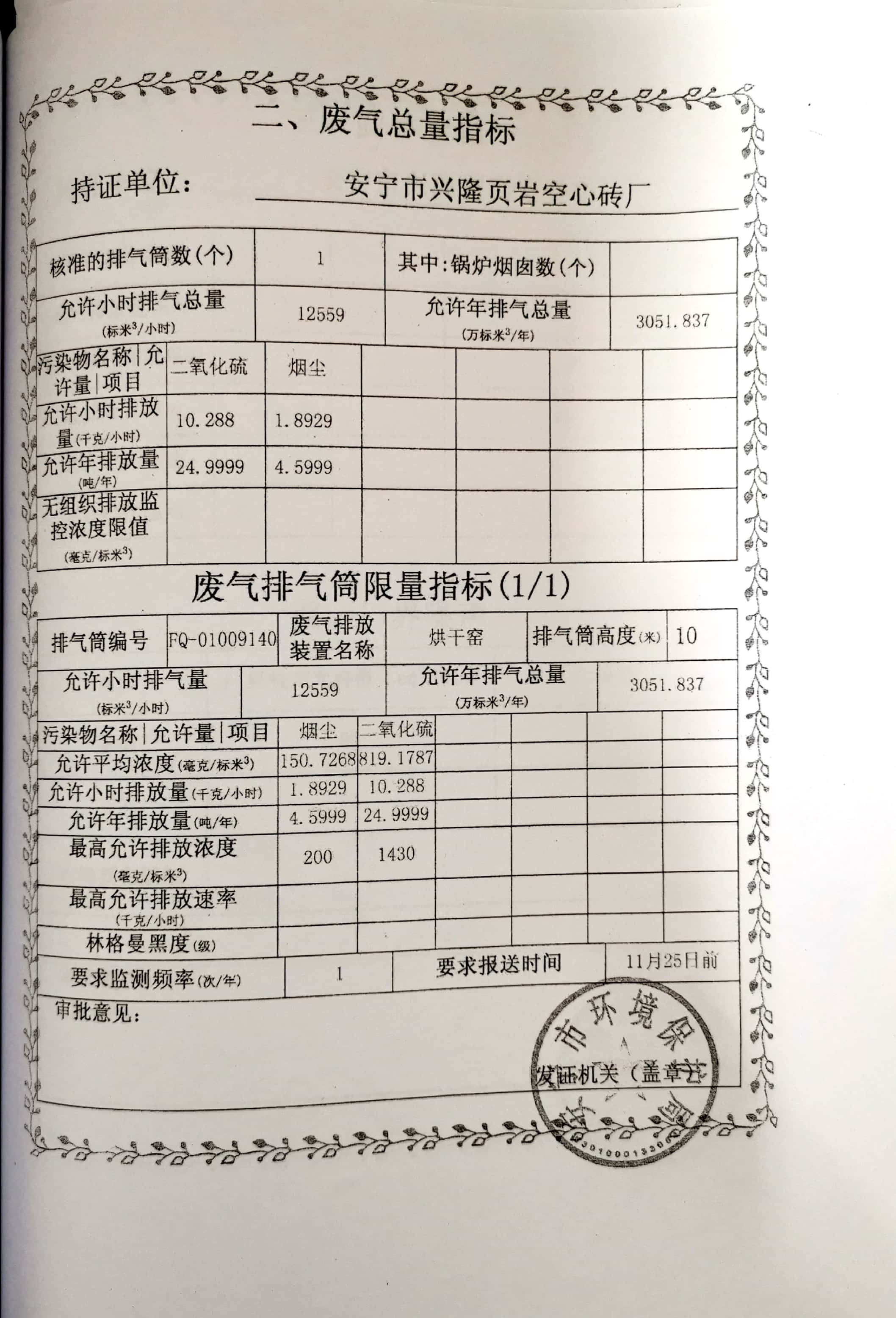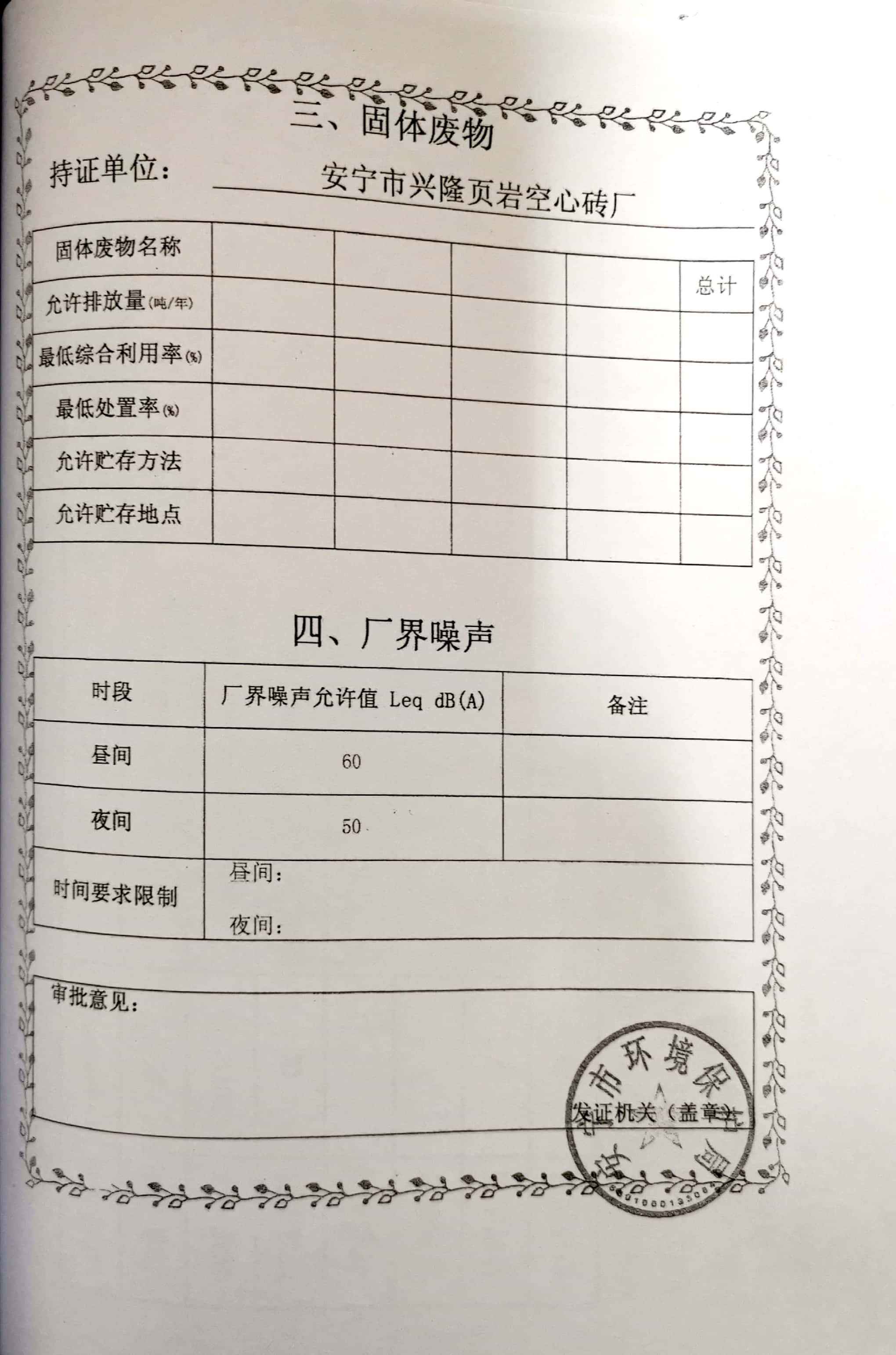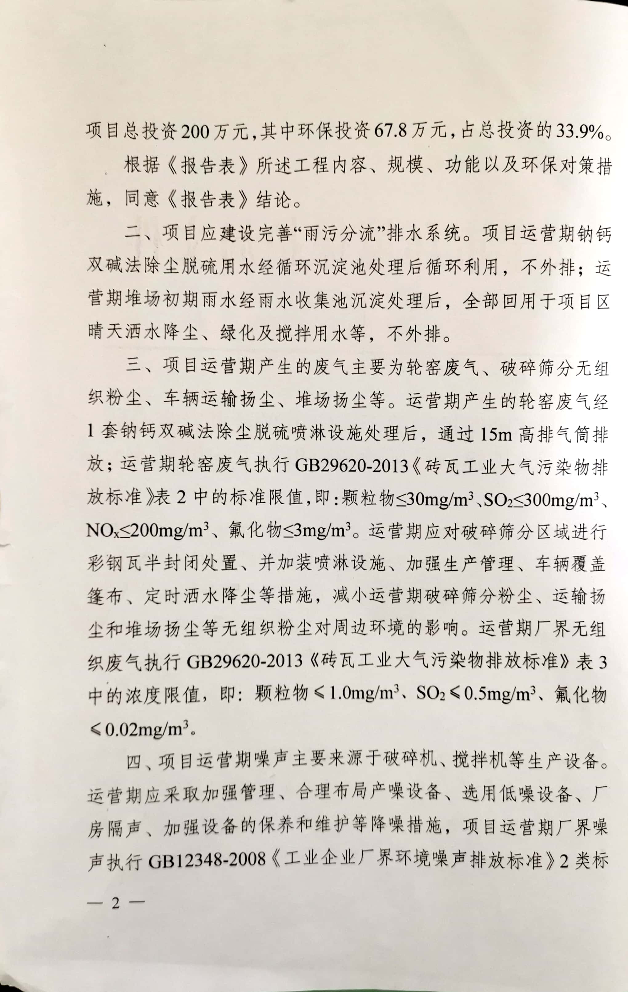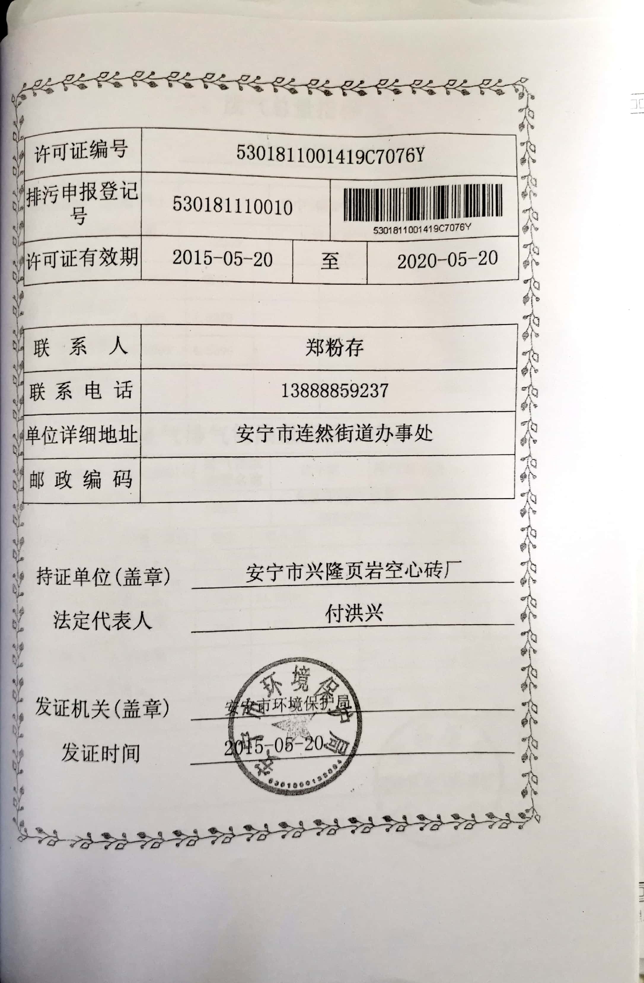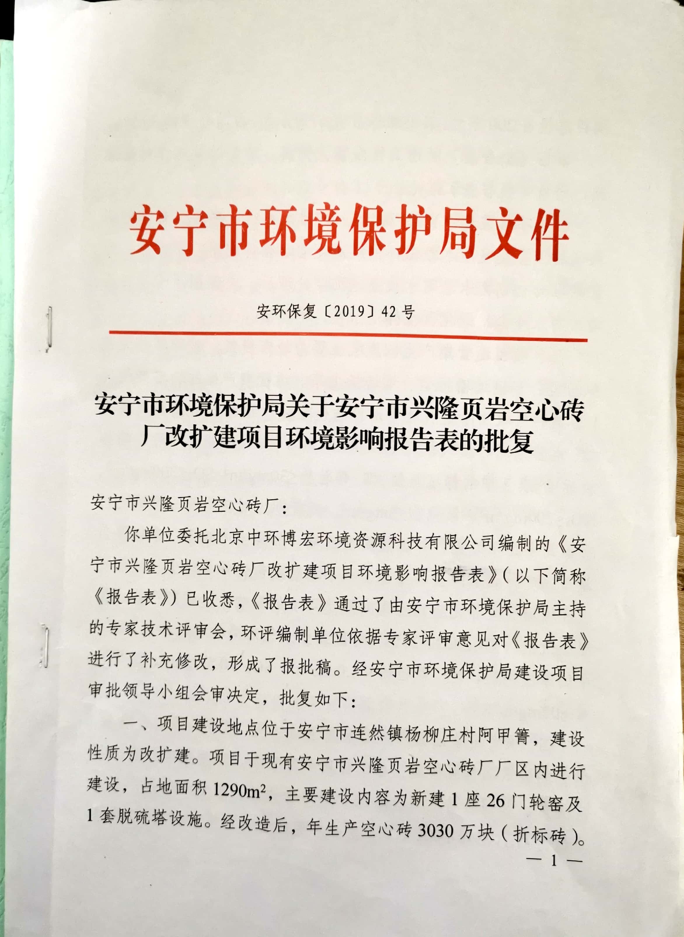 項目建設過程環(huán)保審批情況:2019年4月,北京中環(huán)博宏環(huán)境資源科技有限公司編制完成《安寧市興隆頁巖空心磚廠改擴建項目環(huán)境影響報告表》;2019年5月22日,該項目獲得安寧市環(huán)境保護局“關于《安寧市興隆頁巖空心磚廠改擴建項目環(huán)境影響報告表》的批復”安環(huán)保復【2019】42號。
