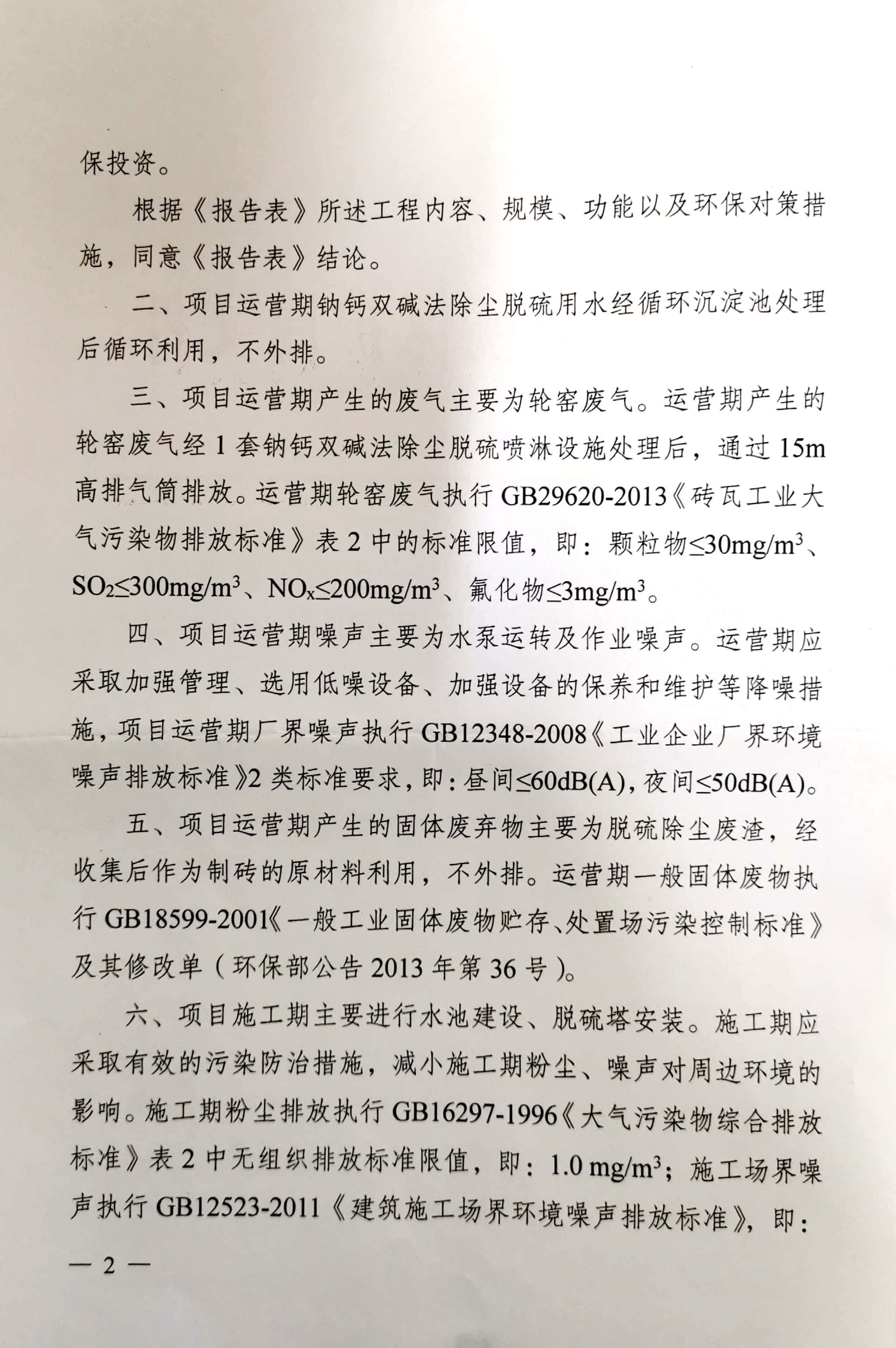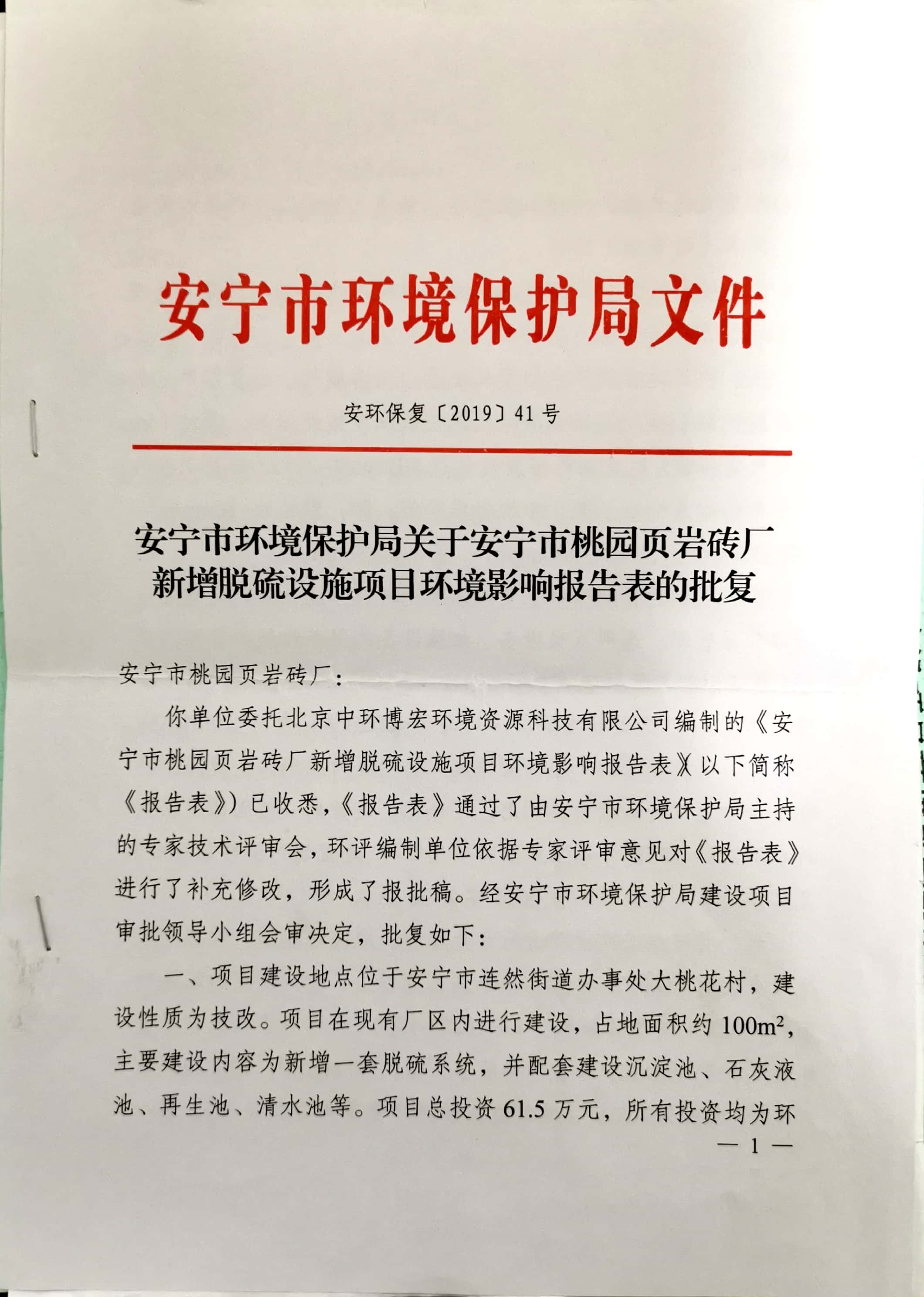 項(xiàng)目建設(shè)過程環(huán)保審批情況:2019年4月,北京中環(huán)博宏環(huán)境資源科技有限公司編制完成《安寧市桃園頁巖磚廠新增脫硫設(shè)施項(xiàng)目環(huán)境影響報(bào)告表》;2019年5月22日,該項(xiàng)目獲得安寧市環(huán)境保護(hù)局“關(guān)于《安寧市桃園頁巖磚廠新增脫硫設(shè)施項(xiàng)目環(huán)境影響報(bào)告表》的批復(fù)”安環(huán)保復(fù)【2019】41號(hào)。