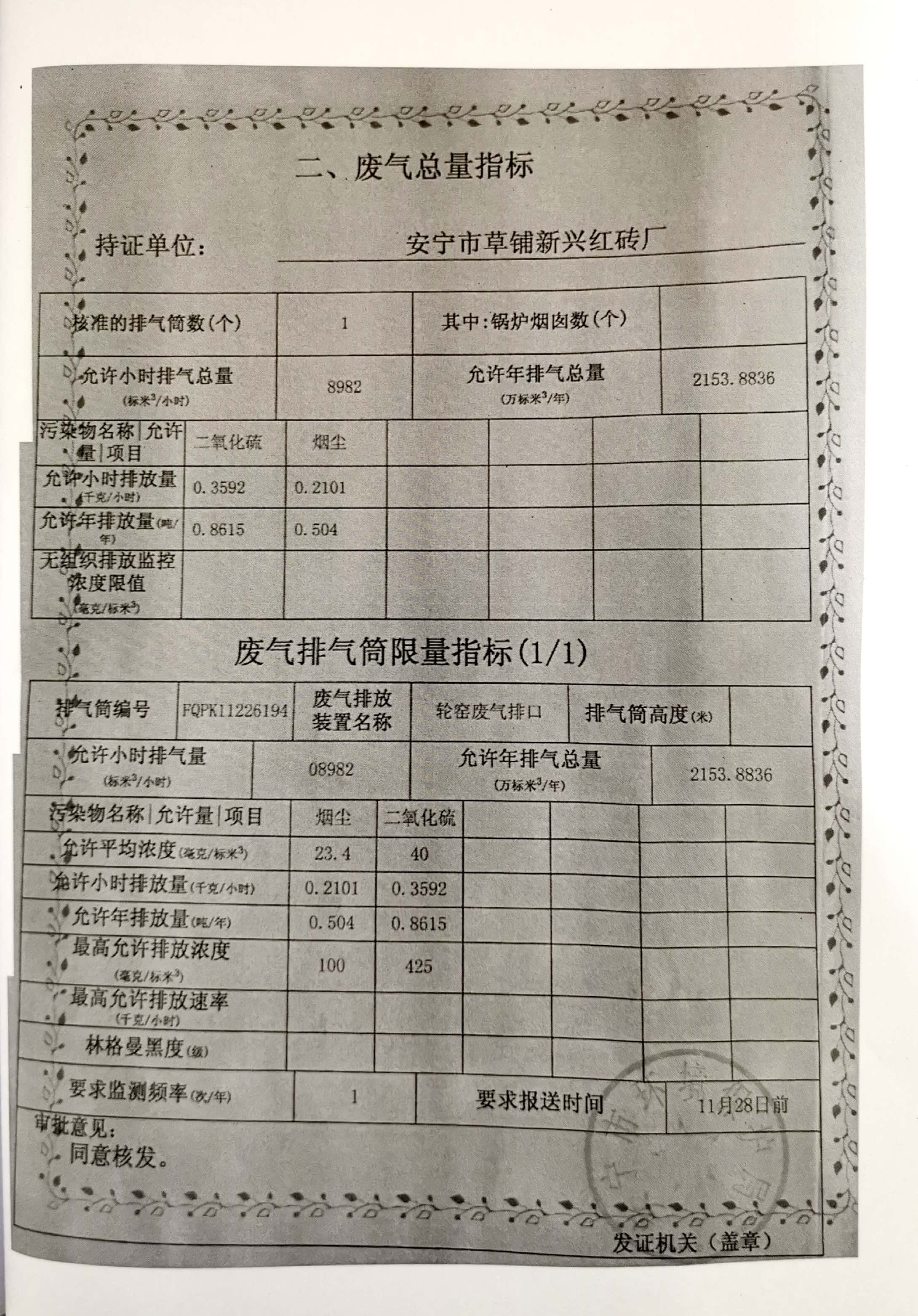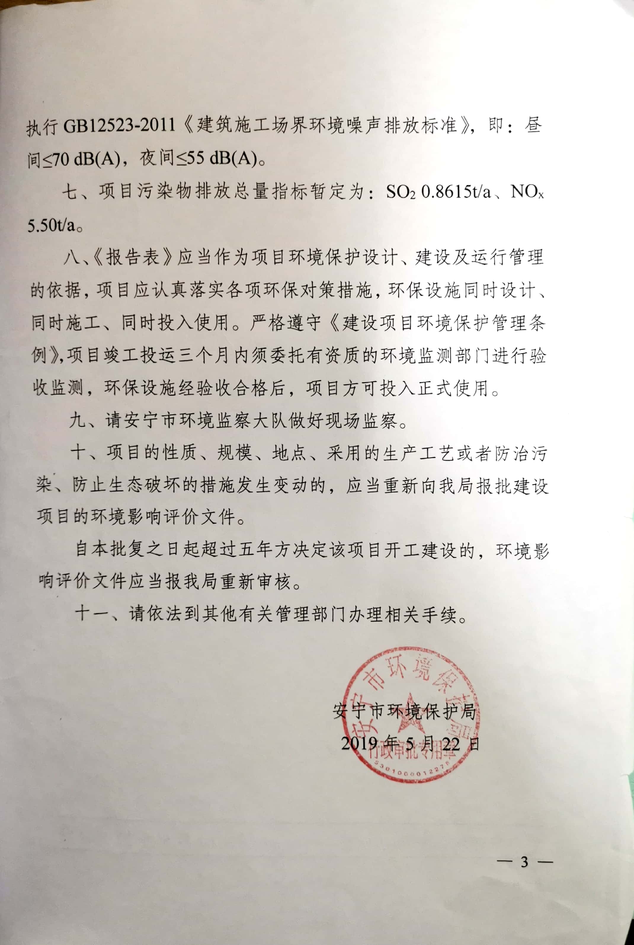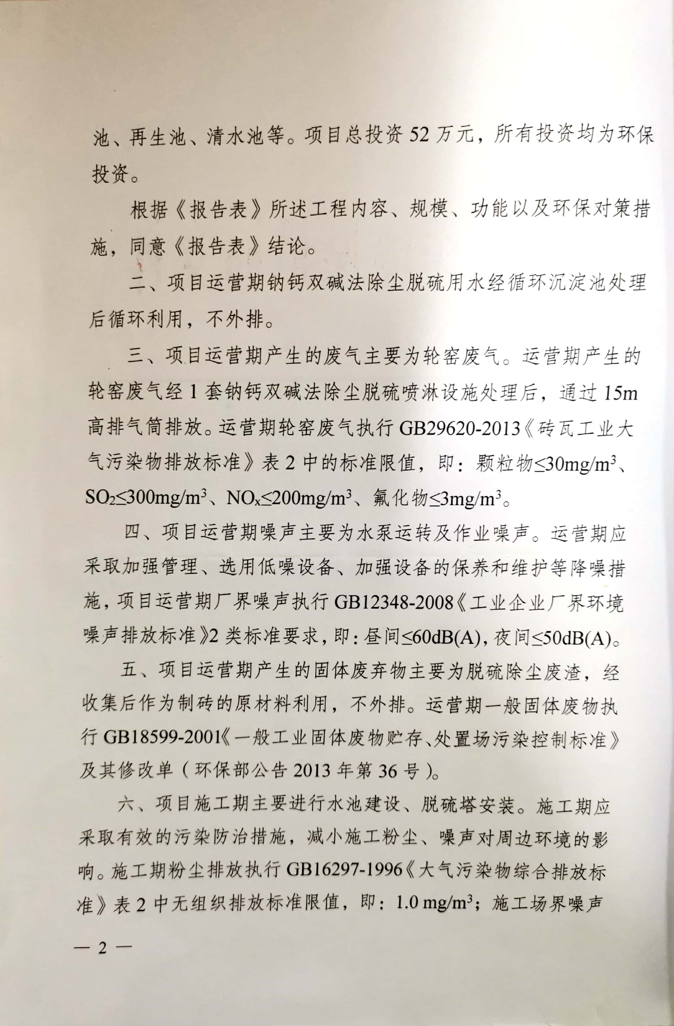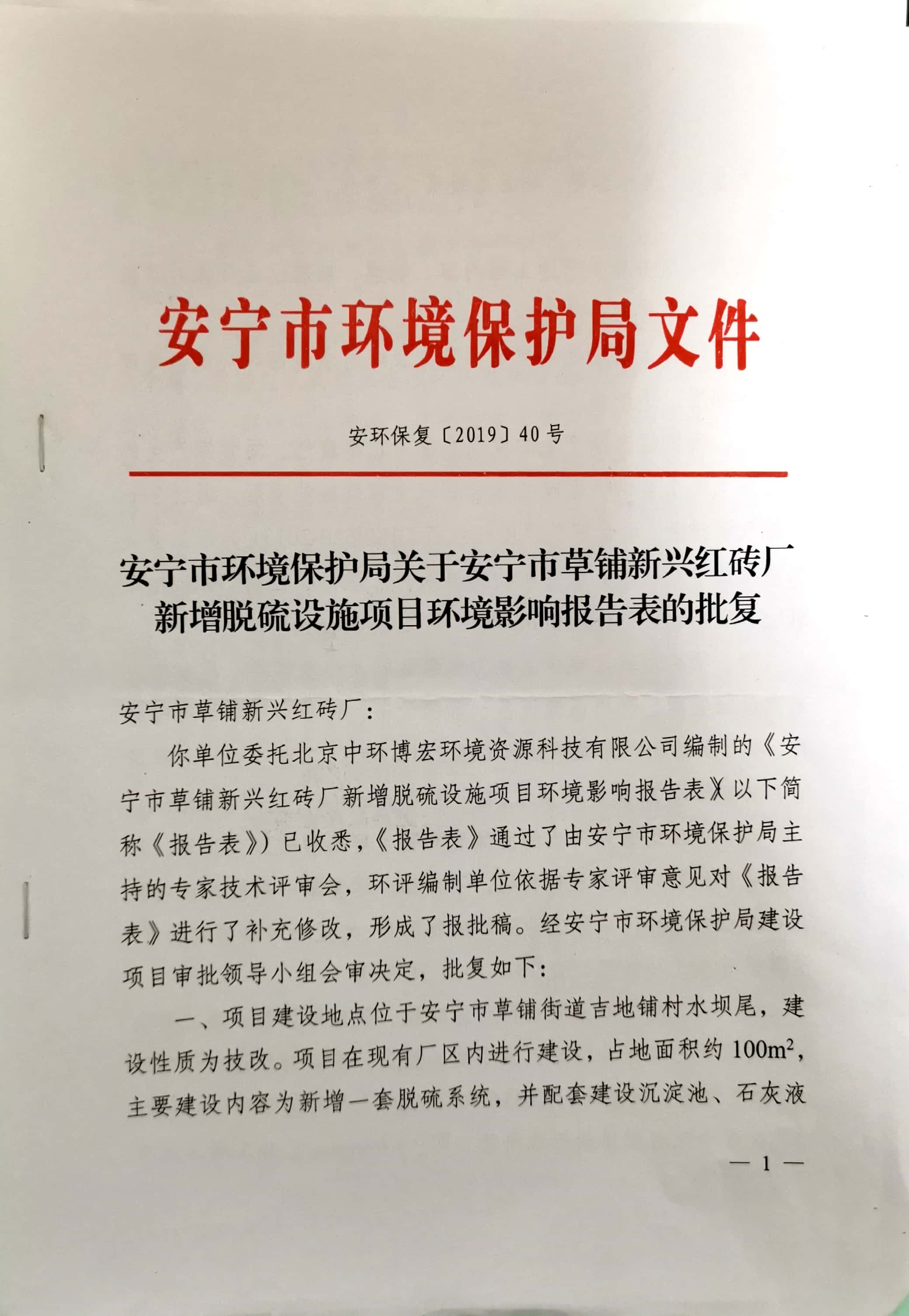 項目建設過程環保審批情況:2019年4月,北京中環博宏環境資源科技有限公司編制完成《安寧市草鋪新興紅磚廠新增脫硫設施項目環境影響報告表》;2019年5月22日,該項目獲得安寧市環境保護局“關于《安寧市草鋪新興紅磚廠新增脫硫設施項目環境影響報告表》的批復”安環保復【2019】40號。